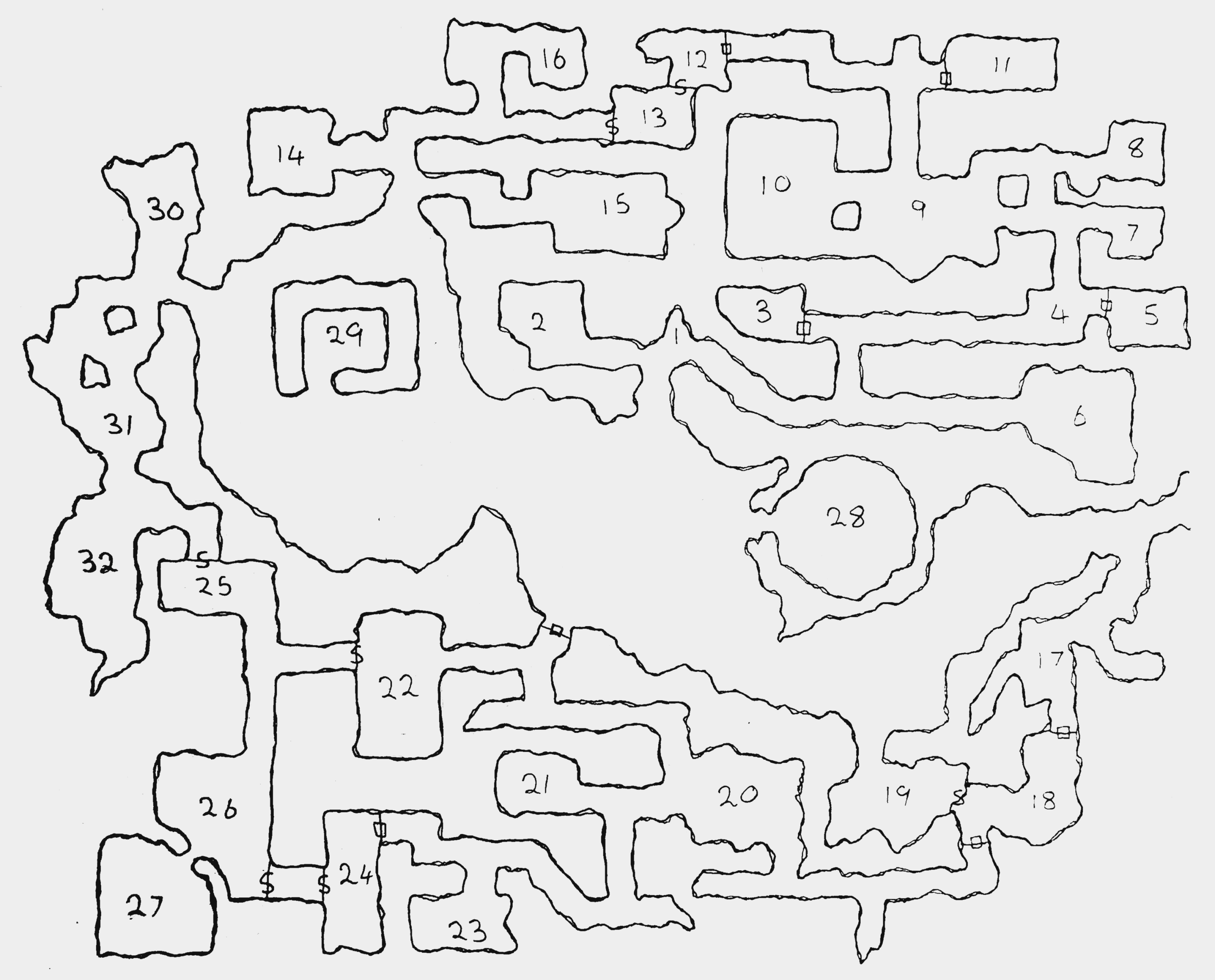 - The final step, and the one I felt most uneasy about, was the map. Part of dungeon creation is sensing out the spatial logic of a space (“why would there be eight lizardmen in this room directly next to the dragon?”), so I felt it was necessary to have one. What I ended up going with was a direct copy of the first 32 rooms of the Caves of Chaos from B2 Keep on the Borderlands: if you look at the map I made, you’ll see that the room layout is almost identical down to the specific undulations on the wall. I did get a little worried that specifically ‘setting’ the map in a cave-like environment would influence people, but I think I stressed that it didn’t need to be the case.