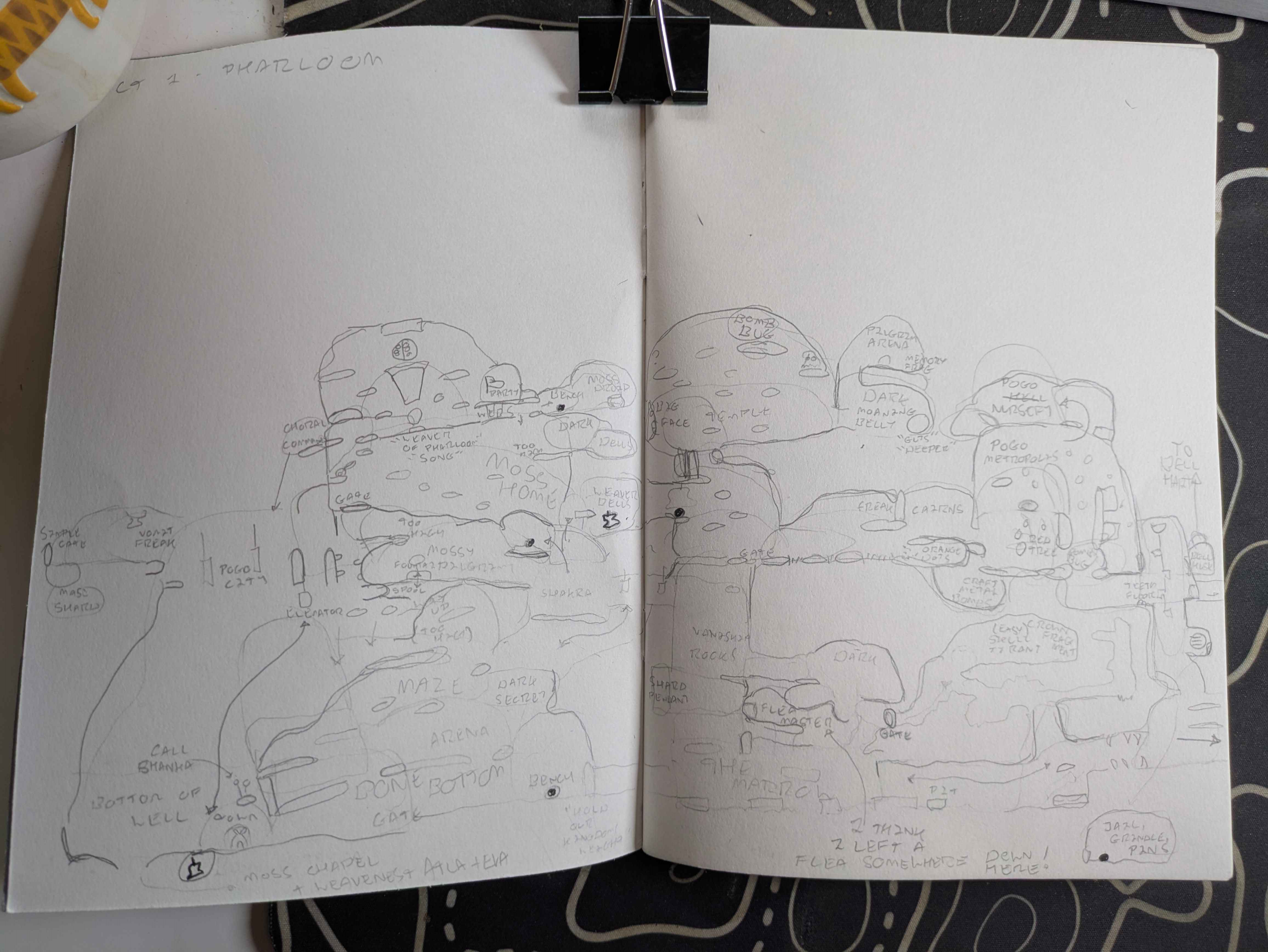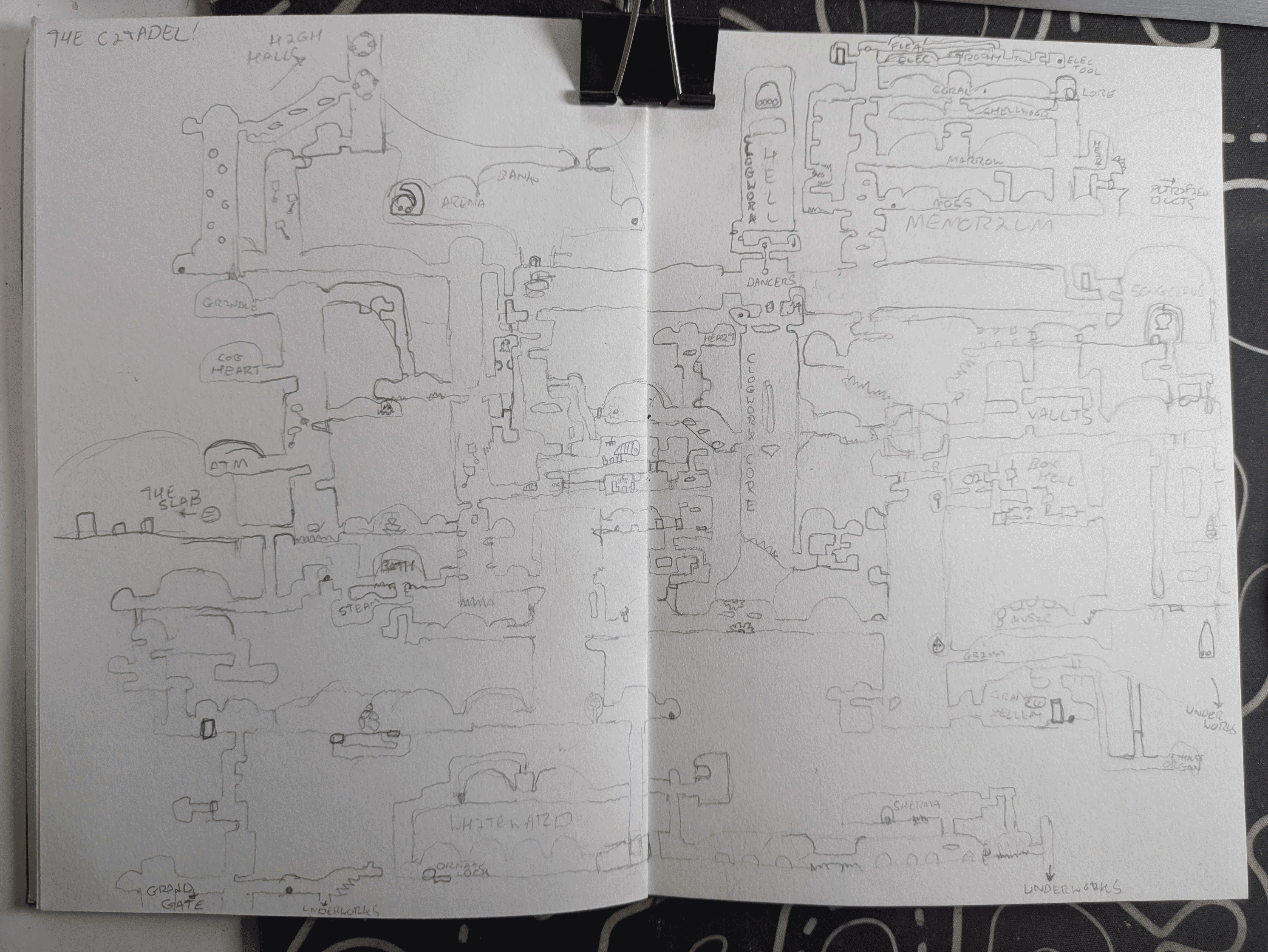 I finally beat Silksong. Here are my hand-drawn maps + proof that I never even unlocked the map tab. There were a couple of dodgy Alt-F4s to avoid having a map foisted upon me, like when it gave you one without warning in the Cogwork Core. Was nice to not have to spend tons of money on Shakra, but according to friends she helps you out in some hard arenas if you buy her maps as they are sold. Welp.